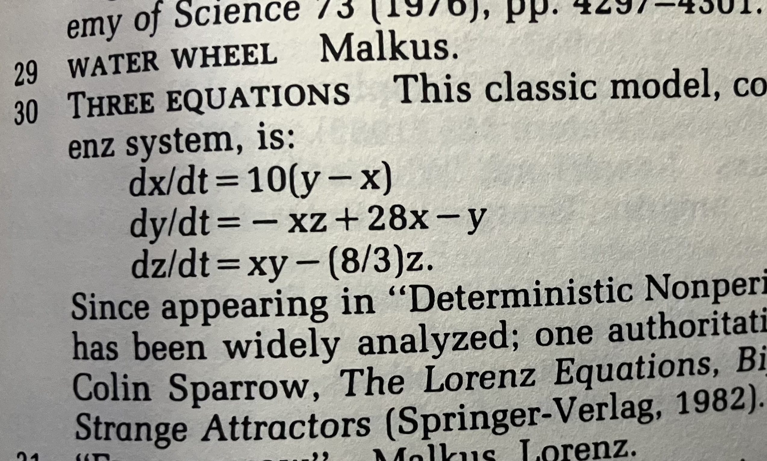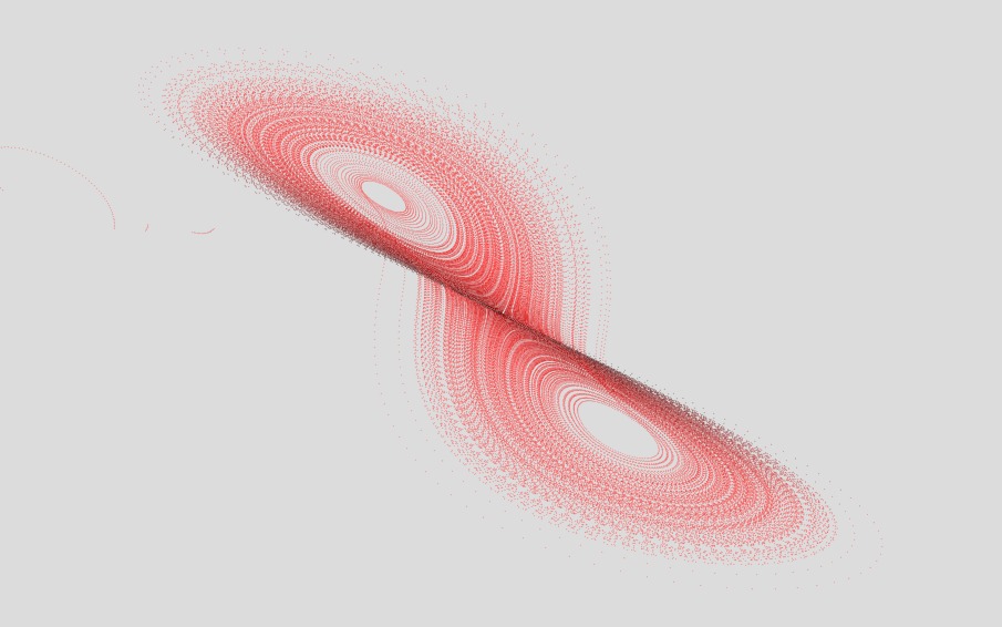 So now in 7th grade, years away from formally learning integration, I gave myself the task of trying to figure this out. So I aproached a teacher in the highschool, and when I showed him the formulas from the book, he told me they couldnt be solved. Which was true, they couldnt be explictily solved, but I wanted to figure out what Lorenz had done and get it to work. So I asked arround a little further, and I learned that dx/dt describes the change of x over the change in time. (I learned this written with the Greek letter Δ instead of ‘d’, so thats what I ended up using in my programs). I also learned that I could multiply both sides of each of the three equations by Δt, and got me into a good state to tinker arround with my program. It took me a long time to figure out what a good value for Δt should be, and I was very happy when my program was able to plot a nice visual of the attractor in less than an hour (which is what happened before I increased Δt by a few OoM).